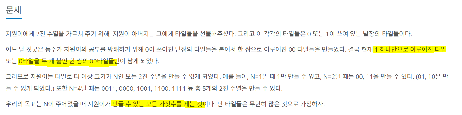 대표적인 DP 유형의 문제로 꼽히는 타일링 문제(정확히 이코테 교재 실전문제 '바닥공사')에서도, 가로 길이가 N, 세로 길이가 2인 바닥을 채우는 모든 경우의 수를 구하는데에 사용되는 덮개의 모양으로 총 세 가지 모양이 주어진다.