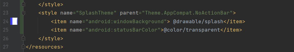 -> splash.xml 파일(스플래쉬 화면)을 만든 후 themes.xml 파일의 style에 새로 만든 splash 테마를 넣어준다